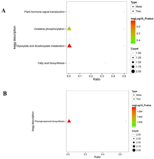 We further integrated metabolomic and transcriptomic data at the pathway level to explore the potential relationship between DEGs and metabolites. The results show that there are four enrichment pathways in ESI− mode, namely plant hormone signal transduction, oxidative phosphorylation, glyoxylic acid and dicarboxylic acid metabolism, and fatty acid biosynthesis (Figure 6), and only one enriched pathway under ESI+ mode, namely phenylpropanoid biosynthesis. Phenylpropanoid biosynthesis plays an important role in the potential relationship between DEGs and metabolites. These results suggest that phenylpropanoid biosynthesis might be the main metabolic pathway regulated by hydrogen water in Ficus hirta Vahl root. Figure 7 shows the heat map of comprehensive analysis between differential metabolite expression patterns and transcriptomics in ESI− mode and ESI+ mode.