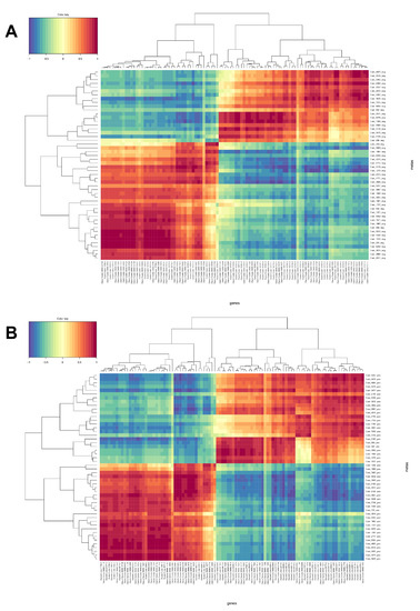 Integrative analysis based on metabolomics and transcriptomics data. (A) Negative ion mode. (B) Positive ion mode. The horizontal axis represents the differentially expressed gene ID number, and the vertical axis represents differential metabolite ID number. The blue depth indicates the intensity of the negative correlation. The red depth indicates the intensity of the positive correlation.
