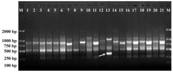 SCoT36 profiles of the 21 different C. morifolium cultivars (lanes 1–21). Lane M: Trans2K DNA markers with specified amplified product lengths (bp). Arrowheads represent specific amplified band in the C. morifolium ‘Daboju’ sample.