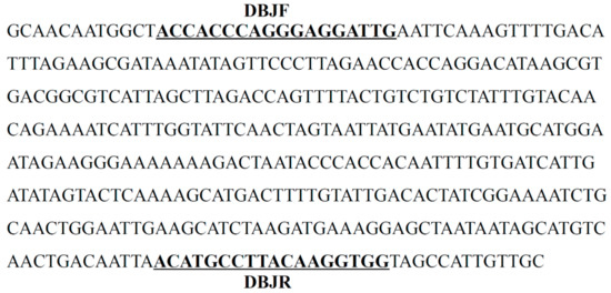 The online tool VecScreen (https://www.ncbi.nlm.nih.gov/tools/vecscreen/, accessed on 28 December 2021) was used to remove vector sequences from the obtained sequence, and the nucleotide database of the BLASTN program (https://blast.ncbi.nlm.nih.gov/Blast.cgi, accessed on 28 December 2021) was used to identify the similarities between sequences. Ultimately, the sequence obtained was submitted to the GenBank database (GenBank accession number: OL456174) [52]. The SCAR primer pair (named DBJF/DBJR) was designed based on the specific 385-bp nucleotide sequence of the ‘Daboju’-specific SCoT36-385 amplicon, obtained using Primer Premier 5 software [53] (Table 2), and synthesized by Shanghai Sangon Biological Engineering Technology and Service Co. Ltd., Shanghai, China.