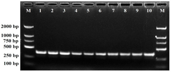 The designed SCAR primer pair DBJF/DBJR was then used to amplify genomic DNA from the 21 chrysanthemum cultivars at the optimum annealing temperature of 62 °C to evaluate the specificity of amplification. The amplification profile of the primer pair DBJF/DBJR is shown in Figure 3. The results showed that a clear, specific amplicon of 360 bp was generated from the ‘Daboju’ DNA samples by the primer pair, but no amplicons were detected from DNA samples from any of the other 20 chrysanthemum cultivars. The SCAR primer pair DBJF/DBJR did not contain the sequence of the original SCoT primer, thus giving rise to amplification products shorter than the original selected sequence, which should increase the specificity of amplification. Furthermore, the stability and specificity of the SCAR primer pair DBJF/DBJR were further validated in different DNA samples from ten ‘Daboju’ populations. The results showed the specific amplicon of the primer pair DBJF/DBJR at 360 bp with all ten samples confirming the identity of all ten ‘Daboju’ populations (Figure 4).