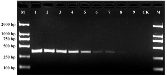 The sensitivity of the SCAR markers (DBJF/DBJR) with different C. morifolium ‘Daboju’ genomic DNA concentrations in a 20 µL PCR mixture. Lane M: Trans2K DNA Marker with specified amplification product band lengths (bp); lanes 1–9: 50 ng/µL, 40 ng/µL, 30 ng/µL, 20 ng/µL, 10 ng/µL, 5 ng/µL, 1 ng/µL, 100 pg/µL, and 10 pg/µL, respectively; lane CK: ddH2O, instead of the DNA template of C. morifolium ‘Daboju’.