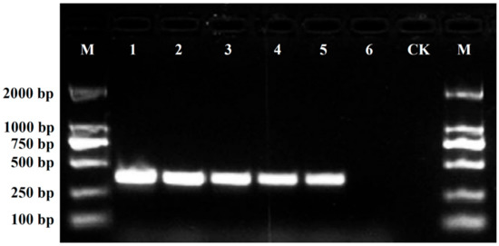 Amplification profiles of the primer pair DBJF/DBJR in genomic DNA composed of different combinations of C. morifolium cultivars. Lane M: Trans2K DNA markers with specified amplification product band lengths (bp); lanes 1–6: different proportions of adulteration of C. morifolium cultivars, with details of the adulterations provided in Table 3; lane CK: ddH2O, instead of the DNA template of C. morifolium cultivars.