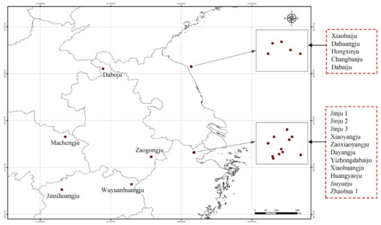 Twenty-one chrysanthemum cultivars, including ‘Jinju 1,’ ‘Jinju 2,’ ‘Jinju 3,’ ‘Xiaoyangju,’ ‘Zaoxiaoyangju,’ ‘Dayangju,’ ‘Yizhongdabaiju,’ ‘Xiaohuangju,’ ‘Huangyaoju,’ ‘Jiuyueju,’ ‘Zhaohua 1,’ ‘Jinsihuangju,’ ‘Daboju,’ ‘Zaogongju,’ ‘Wuyuanhuangju,’ ‘Xiaobaiju,’ ‘Machengju,’ ‘Dahuangju,’ ‘Hongxinju,‘Changbanju,’ and ‘Dabaiju,’ were collected from their main cultivation areas (Figure 7) for SCoT analysis by pooling fresh leaves from at least six individuals of each cultivar (Table 4). These plant materials were preserved and cultivated at the Tongxiang Chrysanthemum Experimental Field of the Zhejiang Provincial Key Laboratory for Genetic Improvement and Quality Control of Medicinal Plants, Hangzhou Normal University, Zhejiang Province, China. Voucher samples were deposited at the Zhejiang Provincial Key Laboratory for Genetic Improvement and Quality Control of Medicinal Plants. Relevant morphological features of flowers of samples are shown inFigure 8, respectively. In addition, tissue samples from 10 ‘Daboju’ populations (Table 5) collected from Zhejiang and An’hui provinces (Figure 9) were selected for validating the SCAR marker, using fresh leaves pooled from at least eight individuals of each population.