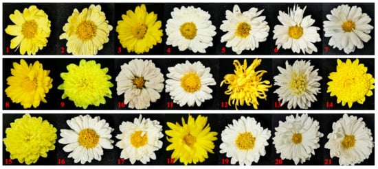 The flower morphology of 21 C. morifolium cultivars (1–21). Details of 21 C. morifolium cultivars are provided in Table 4.