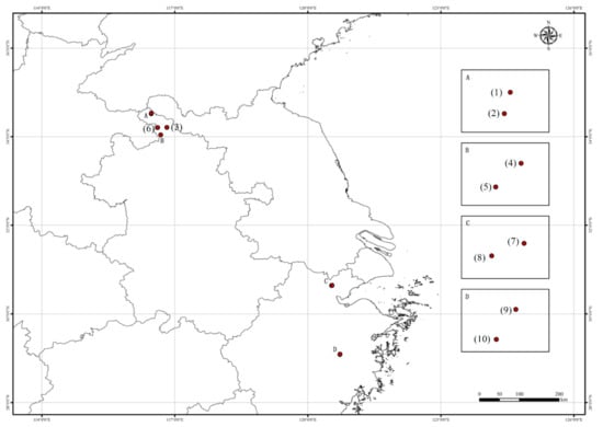 Sampling locations of 10 C. morifolium ‘Daboju’ populations. Numbers 1–10 are the same as those in Table 5.