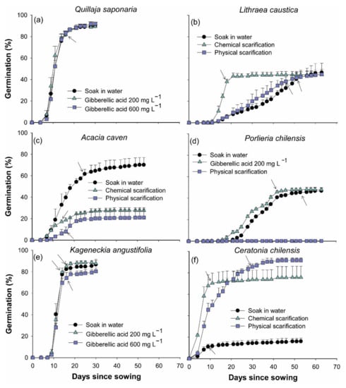 Germination (%) observed in Quillaja Saponaria (a), Lithraea caustica (b), Acacia caven (c), Porlieria chilensis (d), Kageneckia angustifolia (e), and Ceratonia chilensis (f) according to different pre-germination treatments. Arrows indicate the day after sowing where no further increment in germination was observed. Symbols indicate mean + s.d.