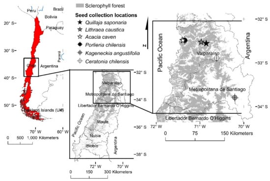 Six tree species from the sclerophyll forest were selected between Valparaíso and Biobío regions, three were selected according to dominance and three according to the degree of ecological vulnerability (for a full description of the species see Table S1). Vulnerability was referred to the conservation state according to the Classification Regulation of the Species from the Environmental Ministry of Chile []. Regarding the dominance criteria Q. saponaria, L. caustica and A. caven were selected, while P. chilensis, (vulnerable), K. angustifolia (near threatened) and C. chilensis (vulnerable) were selected according to conservation criteria.