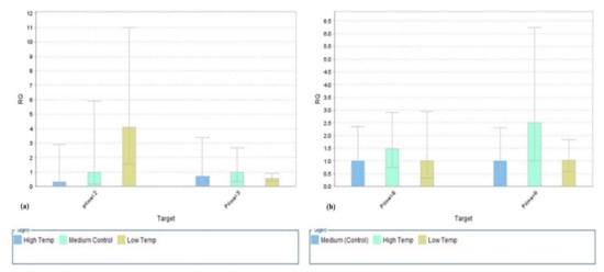 Relative quantification (RQ) of the heat shock transcription factor (SlyHSF-02 and 3, (a)) (SlyHSF-08 and 09, (b)) genes under different temperature regimes. (High temperature = 42 °C, low temperature = 12 °C, medium temperature = 25 °C). Beta-actin gene was used as an internal control for quantitative expression.