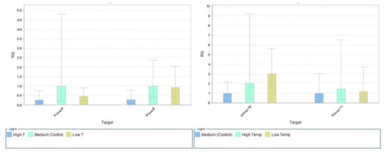 From the figure, it was predicted that all the genotypes recorded upregulation of the heat shock transcription factors (HSFs) at high temperatures as compared to medium and low temperatures (Figure 1). Furthermore, the expression was also recorded more at low-temperature collections of the samples as compared to the control (medium temperature).