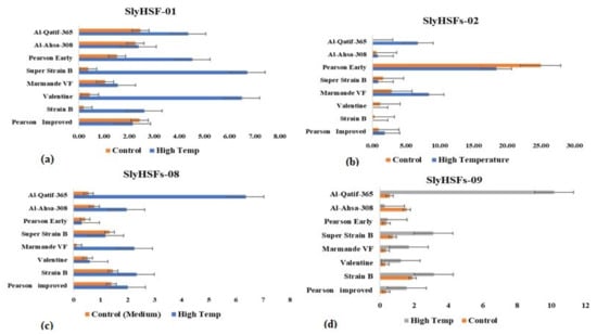 Fold change expression difference of individual tomato genotypes using different heat shock transcription factors genes ((a) SlyHSF-1, (b) SlyHSF-2, (c) SlyHSFs-8, (d) SlyHSFs-9).