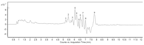 LC-MS chromatogram of WNAE showed peak identification of phytochemical compounds. Peak identification: peak 1, (+)-delta-Tocopherol; peak 2, kaempferitrin; peak 3, ouabain; peak 4, convallatoxin; peak 5, salasodine; peak 6, isorhamnetin-3-O-rutinoside; peak 7, 2′, 3, 3′ 4, 4′-pentahydroxy-4′-glucosulchalcone; peak 8, 4, 8′-Bi ((+)-epicatechin); peak 9, quercetin-3-O-arabinoglycoside.