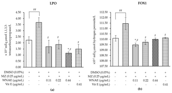 The lipid peroxidation (LPO) and ferric-xylenol orange (FOX1) in cattle sperm treated with MZ, WNAE + MZ, and Vit E + MZ (positive control), and the results are presented in Figure 2.