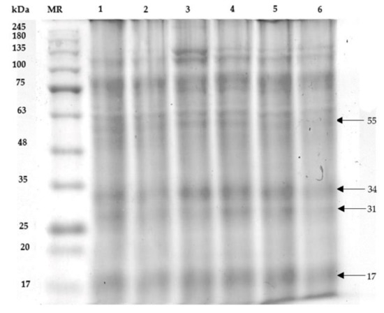 Protein profile of Charolais cattle sperm sample treated as follows: control (1); MZ (2); WNAE at the dose of 0.11 (3); 0.22 (4); 0.44 (5) µg/mL following MZ, and Vit E 0.41 µg/mL following MZ (6) (MR: protein marker, MZ: mancozeb, WNAE: white N. nucifera petals aqueous extraction).