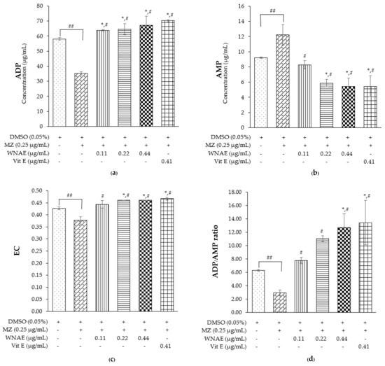 The mean value ± standard deviation (error bars) of ADP (a); AMP (b); EC (c), and ADP/AMP ratio (d). The cattle sperm sample was treated as follows: control, MZ, WNAE 0.11, 0.22, 0.44 µg/mL following MZ, and Vit E 0.41 µg/mL following MZ (MZ: mancozeb, WNAE: white N. nucifera petals aqueous extraction). Data was obtained from three replications (n = 3). * Denotes the significant differences from control group at p ≤ 0.05. # Denotes the significant differences from MZ group at p ≤ 0.05. ## Denotes the significant differences between MZ and control group at p ≤ 0.05.