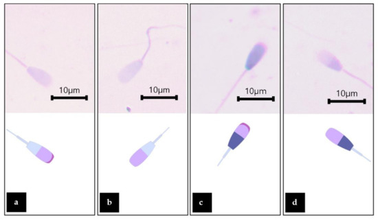 Viability and acrosome integrity classification of Charolais cattle sperm stained with TB/Giemsa: Sperm and graphic drawings were demonstrated as viable sperm with intact acrosome (a); Viable sperm with detached acrosome (b); dead sperm with intact acrosome (c), and dead sperm with detached acrosome (d) showed at a magnification of 1000×.
