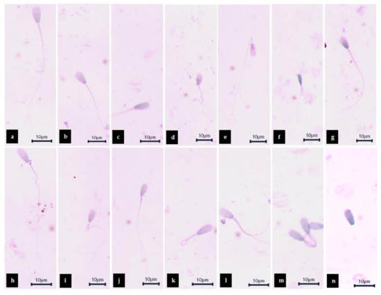 Morphological classification of Charolais cattle sperm stained with TB/Giemsa: Normal sperm (a); Sperm with different patterns of abnormal head (b,c): pear shaped head (b); Tapered head(c), Sperm with different patterns of abnormal head and tail (d–g): short head with irregular shaped tail (d); Tapered head with bent tail (e); Microcephalus head and hairpin tail (f); Macrocephalus head with edema tail (g), and sperm with different patterns of abnormal tail (h–n): irregular shaped tail (h); Bent tail (i); Thick midpiece (j); Hairpin tail (k); Multiple tail (l); Coiled tail under the head (m); No tail (n), showed at a magnification of 1000×.