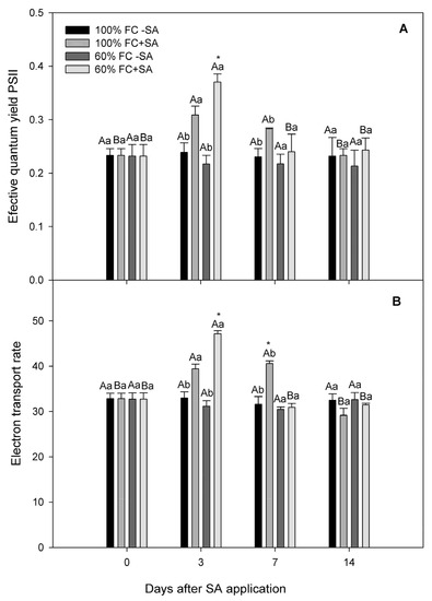 Photochemical parameters in A. chilensis plants grown under 100% and 60% FC and two SA doses (0 and 0.5 mM) at different times. (A) effective quantum yield (ΦPSII) and (B) electron transport rate (ETR). The bars are means ± SE (n = 3). Different uppercase letters indicate significant differences among days for the same SA and irrigation treatment according to Tukey’s test (p ≤ 0.05). Different lowercase letters indicate significant differences between SA treatment for the same irrigation treatment and time post SA application according to Tukey’s test (p ≤ 0.05). According to Tukey’s test, asterisks indicate significant differences between irrigation treatments of the experiment for the same SA treatment and time post SA application (p ≤ 0.05).