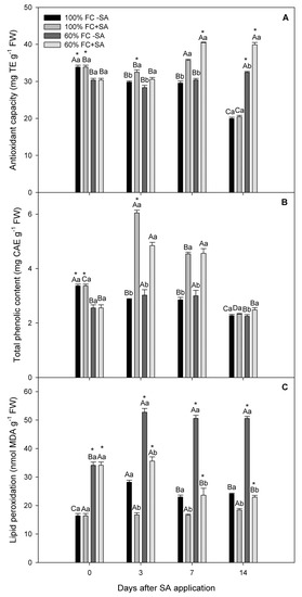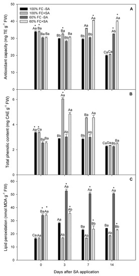 Non-enzymatic antioxidant system and oxidative stress in A. chilensis plants grown 100% and 60% FC and two SA doses (0 and 0.5 mM) at different times. (A) Antioxidant capacity, (B) total phenolic content, and (C) lipid peroxidation. The bars are means ± SE (n = 3). Different uppercase letters indicate significant differences among times post SA application for the same SA and irrigation treatment according to Tukey’s test (p ≤ 0.05). Different lowercase letters indicate significant differences between SA treatment for the same irrigation treatment and time post SA application according to Tukey’s test (p ≤ 0.05). According to Tukey’s test, asterisks indicate significant differences between irrigation treatments of the experiment for the same SA treatment and time post SA application (p ≤ 0.05).
