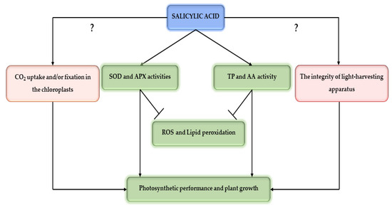 Therefore, we hypothesized that SA application triggers enzymatic and non-enzymatic antioxidant mechanisms, which ameliorate oxidative stress, improving photosynthesis performance and plant growth of A. chilensis plants subjected to moderate drought stress. Thus, the aim of this study was to study the role of SA application on enzymatic and non-enzymatic antioxidants, photosynthetic performance, and plant growth in A. chilensis plants subjected to moderate drought stress. Our results provide new knowledge into the role of SA on the antioxidant defense system in A. chilensis to tolerate moderate drought stress.
