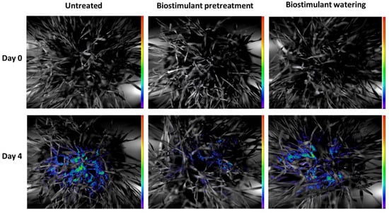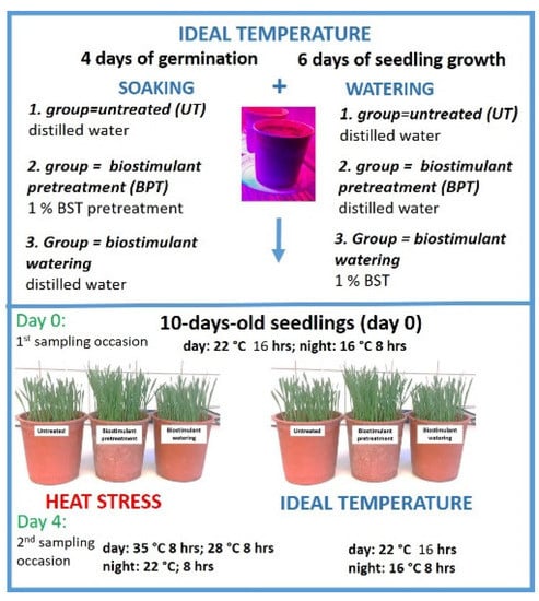 - Biostimulant pretreatment (BPT): the seedlings in the second group were pretreated with the biostimulant as indicated above, but after sowing and 4 days of germination, they were only watered with distilled water.