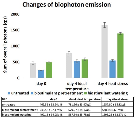 APA StyleJócsák, I., Gyalog, H., Hoffmann, R., & Somfalvi-Tóth, K. (2022). In-Vivo Biophoton Emission, Physiological and Oxidative Responses of Biostimulant-Treated Winter Wheat (Triticum eastivum L.) as Seed Priming Possibility, for Heat Stress Alleviation. Plants, 11(5), 640. https://doi.org/10.3390/plants11050640