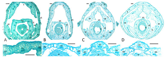Androecium fusion in Galega orientalis as seen in a series of transverse sections of the preanthetic flower on different levels ((A) is closest to the receptacle, while (D) is the most distal position) via light microscopy. On each level, the upper image represents overall topography, while the lower is a magnification of the vexillary stamen. All images are oriented with their adaxial sides upwards. Key: ct = calyx tube; f = flag; k = keel; o = ovary; os = outer adaxial stamen (as traced by its vascular bundle); s = sepal; st = staminal tube; vs = vexillary stamen (C,D) or its bundle (A,B); w = wing. Scale bars: 100 μm.
