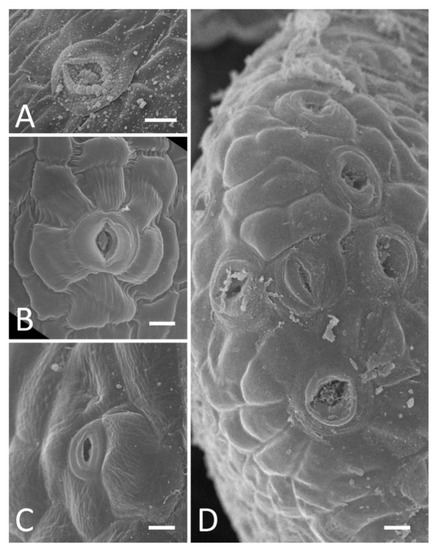 SEM images of stomata on nectaries (A,B,D) and calyx (C). (A), Vicia sylvatica; (B,C), Astragalus cicer; (D), V. sepium. Images (B–D) have the same magnification. Scale bars: 10 μm.