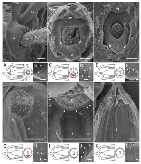 Figure 4. Localization of floral nectaries in selected representatives of the IRLC. (A,C,E,G,I) represent the overall morphology (above, SEM) and schematic representations of nectaries in side (below left) and top (below right) views. (K) depicts a nectarless floral cup (SEM). (B,D,F,G,J,L) are closer views of nectariferous areas, or a similar region in nectarless flower (L). All or most floral organs are removed. (A,B), Wisteria sinensis; (C,D), Trifolium lupinaster; (E,F), Vicia sepium; (G,H), Astragalus cicer; (I,J), Galega orientalis; (K,L), Ononis spinosa. Key: red color = secretory area (on schemes); arrows = outer borders of secretory area (on SEM images); arrowheads = exemplary nectariferous stomata; c = carpel or place where it was localized; h = hypanthium; n = nectariferous area; p = perianth; r = receptacle; s = staminal tube; vs. = vexillary stamen or place where it was localized. Scale bars: 300 μm (A,C,E,G,I,K), 30 μm (B,D,F,H,J,L). - A rim-like toroidal ridge surrounding a carpel’s base but with stomata present only on the outer abaxial side: T. lupinaster (Figure 4C,D), T. medium (Supplement File S1).