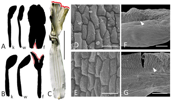 Corolla morphology in normal (A,D,F) and abnormal (B,C,E,G) flowers of Astragalus albispinus. (A,B): contours of petals; (C): flag of abnormal flower (stereomicroscope image) with venation visible; (D–G): epidermal cells (SEM image) of flag (D,E) and wing (F,G) external surfaces. Key: f = flag; k = keel petal; w = wing; red line = portion of petal damaged in the course of dissection; arrowhead = ridge-like sculpture. Scale bars: 2 mm (C), 300 μm (F,G), 30 μm (D,E).
