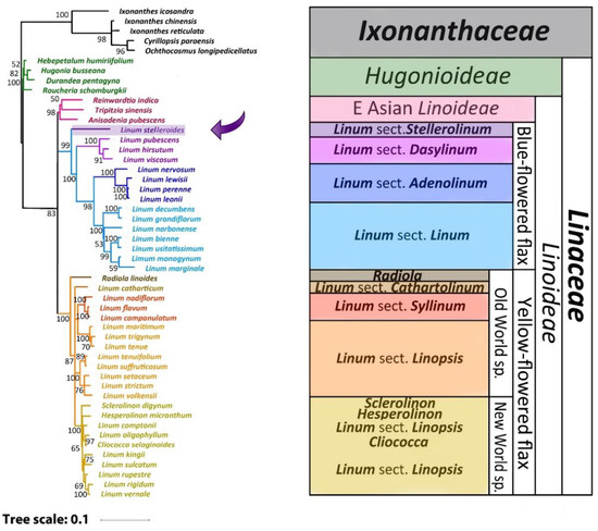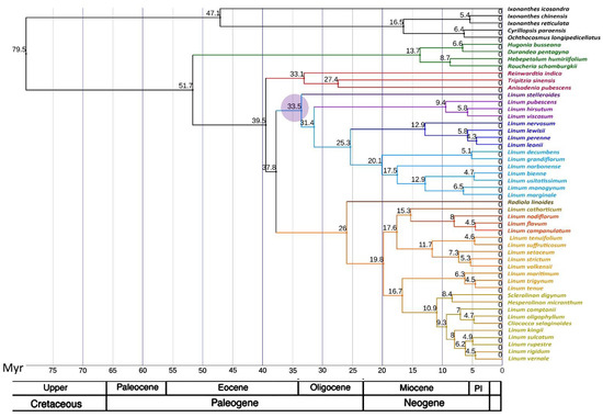 Bayesian chronogram of 45 taxa of Linaceae and 5 taxa of Ixonanthaceae. The values shown above branches are the dates of the nodes. The purple circle marks the point of the sect. Stellerolinum divergence from the common trunk of the blue-flowered flax. Pl on the geochronological scale—Pliocene.