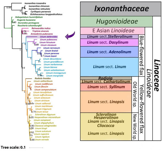 - McDill, J.; Repplinger, M.; Simpson, B.; Kadereit, J. The Phylogeny of Linum and Linaceae Subfamily Linoideae, with Implications for Their Systematics, Biogeography, and Evolution of Heterostyly. Syst. Bot. 2009, 34, 386–405. [Google Scholar] [CrossRef]