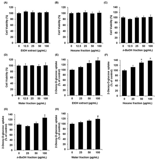 Effects of the EtOH extract of Aster pseudoglehnii and solvent fractions on the glucose uptake in C2C12 cells. MTT assay results of the cell viability of C2C12 cells after 24 h treatment with (A) EtOH extract, (B) n-hexane fraction, (C) n-BuOH fraction, and (D) water fraction, compared with the control (0 μM). Glucose uptake in C2C12 cells after 1 h incubation with (E) EtOH extract, (F) n-hexane fraction, (G) n-BuOH fraction, (H) water fraction, and 2-N-(7-Nitrobenz-2-oxa-1,3-diazol-4-yl) amino)-2-Deoxyglucose (2-NBDG), assessed by glucose uptake assay. Data represent the mean ± standard error of the mean (S.E.M.), n = 3, * p < 0.01, # p < 0.05 compared with the control.