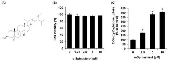 Effects of α-Spinasterol on the glucose uptake in C2C12 cells. (A) Chemical structure of α-Spinasterol; (B) MTT assay results of the cell viability of C2C12 cells after 24-h treatment with α-Spinasterol, compared with the control (0 μM); (C) Glucose uptake in C2C12 cells after 1 h incubation with α-Spinasterol and 2-N-(7-Nitrobenz-2-oxa-1,3-diazol-4-yl) amino)-2-Deoxyglucose (2-NBDG) assessed by glucose uptake assay. Data represent the mean ± standard error of the mean (S.E.M.), n = 3, * p < 0.01, # p < 0.05 compared with the control.