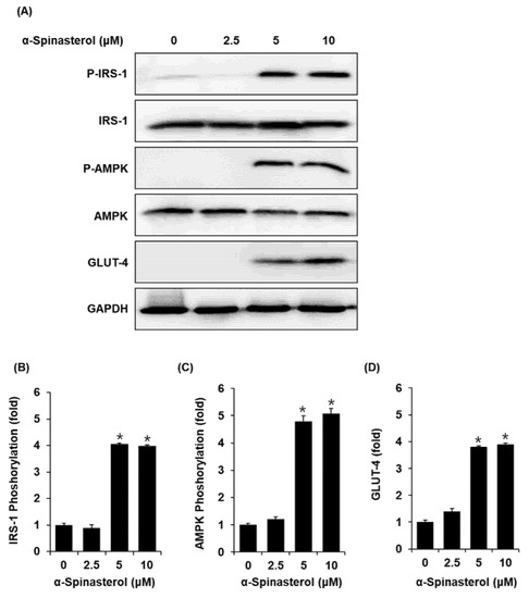 Treatment with 5 and 10 μM α-Spinasterol increased protein expression of GLUT-4 and phosphorylation levels of IRS-1 and AMPK in C2C12 cells when compared with the untreated controls (Figure 3).