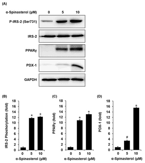 Effect of α-Spinasterol on the protein expression levels of phospho-insulin receptor substrate-2 (P-IRS-2) (Ser731), IRS-2, peroxisome proliferator-activated receptor γ (PPARγ), and pancreatic and duodenal homeobox 1 (PDX-1). (A) Representative protein expression levels of P-IRS-2 (Ser731), IRS-2, PPARγ, PDX-1, and glyceraldehyde 3-phosphate dehydrogenase (GAPDH) in INS-1 cells treated or untreated with 5 and 10 μM α-Spinasterol for 24 h. (B–D) Each bar graph presents the densitometric quantification of Western blot bands. Data represent the mean ± standard error of the mean (S.E.M.), n = 3, * p < 0.01, # p < 0.05 compared with the control.