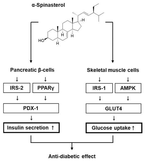 Schematic illustration of the effects of α-Spinasterol isolated from A. pseudoglehnii on glucose-stimulated insulin secretion in pancreatic β-cells and glucose uptake in skeletal muscle cells. IRS-1, insulin receptor substrate-1; IRS-2, insulin receptor substrate-2; AMPK, AMP-activated protein kinase; PDX-1, pancreatic and duodenal homeobox 1; GLUT-4, glucose transporter type 4; PPARγ, peroxisome proliferator-activated receptor γ.