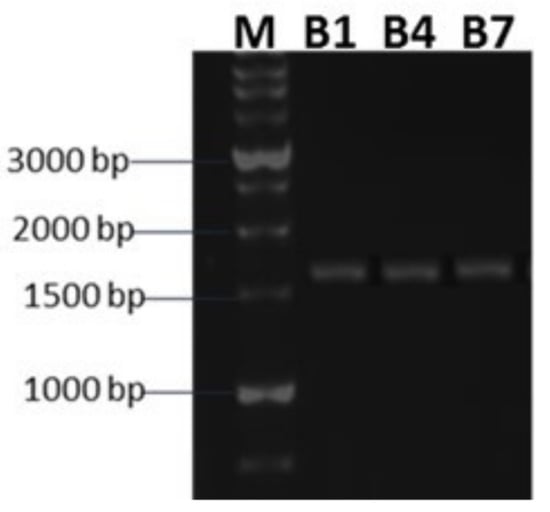 Agarose gel electrophoresis of the amplified PCR fragment for 16 r DNA gene. M: 1 kb DNA marker, isolates with code no. (B1, B4 and B7) (MW~1550 bp).