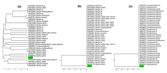 Phylogenetic tree of isolate coded B1SRZS, B4SRZS, and B7SRZS ((a–c), respectively) achieved, displaying the location amid the selected bacteria based on 16Sr RNA sequence assessments.