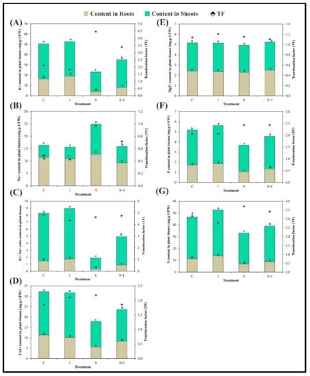 To detect the elemental homeostasis in S. melongena plants, the element contents (K+, Na+, K+/Na+, Mg2+, Ca2+, P, and N) of shoots and roots were determined (Figure 3). Under salinity stress, a significant decrease was observed for all ions except for Na+ compared to control. In contrast, no significant effect of Mg2+ was recorded for S. melongena root or shoot. In the case of the double interaction S + I, there was a significant increase for K+, K+/Na+, Ca2+, P, and N ions (2, 2.8, 5.6, 1.2, 1.3-F in root and 1.4, 2.6, 1.3, 1.2, 1.16-F in shoot, respectively). Whereas, Na+ showed an opposite trend to the other measured ions compared with salt-stressed plants.