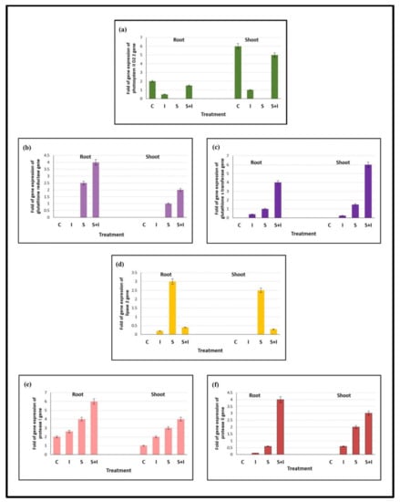 Glutathione reductase (GR) plays an important role in the ascorbate–glutathione cycle under abiotic stress. The gene expression of GR in the current study was increased by about 4-fold and 2-fold for root and shoot, respectively at S + I compared to salt stressed pots (Figure 4b).