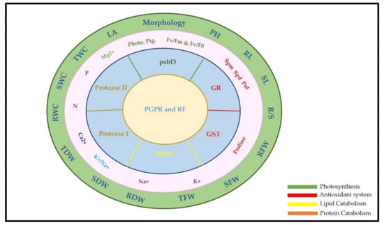 The PGPR and RF selected in the current work suggest a modulatory impact on the systemic resistance of Solanum melongena L. Baldi cultivar to challenging salt stress, which strongly recommends their application as an effective green biofertilizer and biopesticide. Systemic resistance begins with plant genes until morphometric traits (Figure 5). Resistance originates from gene expression related to four of the most treasured physiological aspects in plants, photosynthesis, the antioxidant system, and the catabolism of lipids and proteins. Thus, the collaboration of these genes was reflected in the biochemical constituents in roots and shoots, and sometimes leaves. It seems that psbD enhances photosynthetic pigments and the efficiency of PSII (Fv/Fm and Fv/F0) with no significant change among all treatments. Osmoprotection and antioxidant systems to ROS formed under salinity stress are scavenged and controlled by GR and GST, which might have a role in increasing proline and polyamines content. Elemental homeostasis contributes to either restricting or expelling Na+ ions via the SOS signaling pathway. Catabolism of lipids contributes to preserving the compartment cell membrane while defending against pathogenic diseases and is achieved by lytic proteases. Finally, this was expressed in the morphology and morphometric traits of Solanum melongena L. plants.
