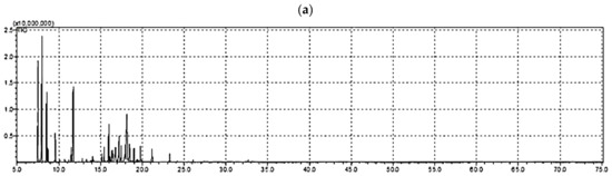 The isolated bark EO was subjected to GC-MS analysis according to Perveen, et al. [52]. Gas chromatography/flame ionization (GC/FID) analysis was carried out using GC-2010 Plus (Shimadzu Corporation, Kyoto, Japan) gas chromatograph supplied with FID-2010 Plus detector and a split/splitless injector. The column was RTX-5MS® fused silica capillary (0.25 μm film thickness and 30 m × 0.25 mm i.d.); the oven temperature was initially kept at 45 °C for 4 min and then increased to 270 °C at 4 °C/min and then held for 15 min. The carrier gas was helium with a flow rate of 2.0 mL/min; the temperatures of detector and injector were 300 and 250 °C, respectively, the split ratio was 1:20 and the injection volume is 1 μL. Quantification of EO components was accomplished by relative parentage area calculations. The relative percentage of the EO constituents was estimated on basis of the FID responses from the total peak area using percentage area normalization [53,54,55]. Gas chromatography/mass spectrometry (GC/MS) data were recorded on GCMS-QP2010 Plus (Shimadzu corporation, Kyoto, Japan). For the mass spectrometer, the ionization energy was 70 eV. The other conditions were identical to those mentioned for GC/FID; however, EI mass spectra were collected over the range of m/z 40–700 in full scan mode. Kovat’s retention indices (RI) were determined with respect to a set of co-injected standard hydrocarbons (C10–C28, Sigma Aldrich, Darmstadt, Germany). Identification of the compounds was carried out by comparing their spectral data and retention indices with Wiley Registry of Mass Spectral Data 10th edition (April 2013), NIST 11 Mass Spectral Library (NIST11/2011/EPA/NIH) and literature data [35]. The identified compounds and their percentages are listed in Table 1.