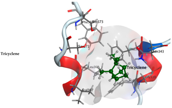 The absorption, metabolism and distribution parameters of tricyclene, α-pinene, d-camphene, limonene, trans-pinocarveol, borneol, α-phellandren-8-ol and α-terpineol were predicted using the SwissADME server. The calculated pharmacokinetic parameters are summarized in Table 5. Tricyclene, α-pinene, d-camphene and limonene have low gastrointestinal tract absorption. However, trans-pinocarveol, borneol, α-phellandren-8-ol and α-terpineol have high gastrointestinal absorption (GI) absorption. The prediction tool suggests the ability of compounds to cross the blood–brain barrier, indicating the increased absorption of compounds to CNS.