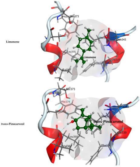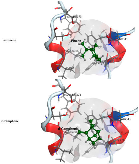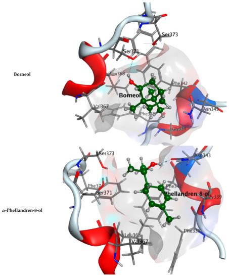 Flexible alignment studies were performed on trans-pinocarveol, borneol, α-phellandren-8-ol and α-terpineol and the co-crystallized ligand of COVID-19 virus spike receptor-binding domain (RBD) using MOE 2019 software [56]. Flexible alignment mode and the resulting conformations were assessed according to the alignment score of the configuration (S). The latter is the sum of the similarity measure of configuration (F), and the average strain energy of the molecules in the alignment in kcal/mol (U). The lower S value indicates better alignment.