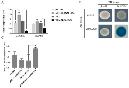 2.3. MdMADS6 Binds to the Promoter of the Carotenoid Biosynthesis Gene MdCCD1