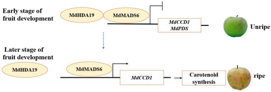 Li, Q.; Wang, T.; Xu, C.; Li, M.; Tian, J.; Wang, Y.; Zhang, X.; Xu, X.; Han, Z.; Wu, T. MdMADS6 Recruits Histone Deacetylase MdHDA19 to Repress the Expression of the Carotenoid Synthesis-Related Gene MdCCD1 during Fruit Ripening. Plants 2022, 11, 668. https://doi.org/10.3390/plants11050668
