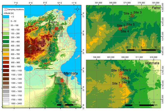 Plant samples were collected from the northern (Fahs) and southern (Matmata) parts of Tunisia (Figure 1). Matmata has an annual mean temperature of 20.6 °C, while Fahs has an annual mean temperature of 18.0 °C. The annual mean precipitation at Matmata and Fahs are 204 and 451 mm·year−1 respectively. Fahs belongs to the Mediterranean or steppe climate zone, while Matmata belongs to the desert climate zone with a drier climate [42]. The vegetations of the collection sites are affected by the Mediterranean climate, which has less precipitation in the summer. Matmata is drier than Fahs throughout the year. The monthly mean temperature and monthly mean precipitation at the sampling locations over the sampling period are shown in Figure 2.