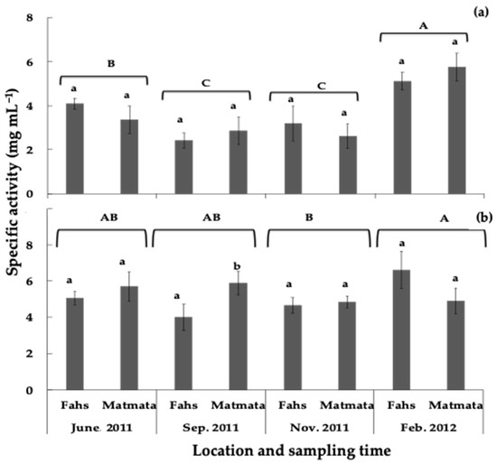 The IBM statistics tool SPSS (SPSS Inc., Chicago, IL, USA, version 21) was used to analyze the data. Data were subjected to a two-way analysis of variance (ANOVA) to determine the significant differences among the samples collected in different months and locations. The sampling months and locations were considered as the independent factors in the analysis. Mean differences among the treatments were compared using the Tukey test at p < 0.05. Pearson’s correlation analysis was conducted to establish significant relationships among the measured parameters.