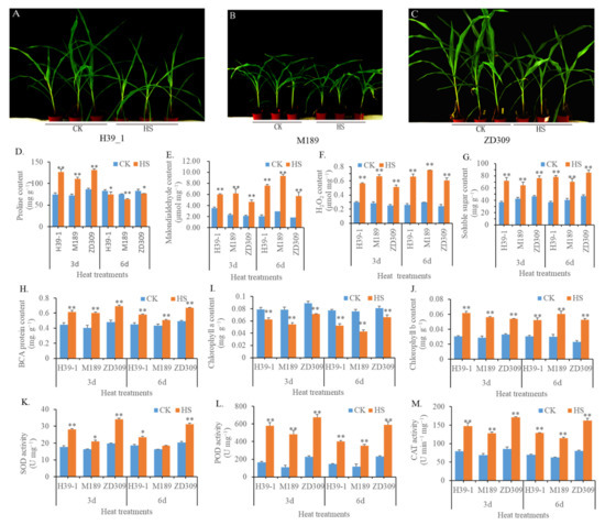 The effects of heat stress on maize growth and physical characters in ZD309 and its parental lines. (A–C) Performance of maize plants treated by 6 days heat stress in H39_1 ((A), maternal line), M189 ((B), paternal line), and ZD309 (C); (D–M) Physical alterations mediated by heat treatments, including proline content (D), malondialdehyde content (E), H2O2 (F), soluble sugar (G), BCA protein (H), chlorophyll a/b content (I,J), as well as SOD, POD, and CAT activity. For the content of proline, soluble sugar content, BCA protein, chlorophyll a/b, the measurement unit, mg g−1, represents the respective content in 1 g of sample’s fresh weight; For the content of malondialdehyde and H2O2, the measurement unit, μmol mg−1, represents the respective content in 1 mg of sample’s fresh weight; For the activity of SOD and POD, the measurement unit, U mg−1, represents the respective activity units detected in 1 mg of sample’s fresh weight; For CAT activity, the measurement unit, U min−1 mg−1, 1 activity unit (U) represents the A240 absorbance decreased 0.1 OD in 1 min and 1 mg of sample’s fresh weight. * and ** represent that the corresponding physical character in heat-stressed maize plants are significantly and very significantly different from the control at p < 0.05 and p < 0.01 levels, respectively.